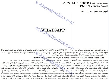 شرکت واتس آپ نیز با ثبت علامت تجاری خود که آن نیز در تاریخ 15 فروردین ماه امسال مورد تایید قرار گرفته، نشانی خود را مونتین ویو کالیفرنیا در امریکا اعلام کرده است و طبقه کالا و خدمات آن نیز همانند شرکت اینستاگرام ثبت شده است.